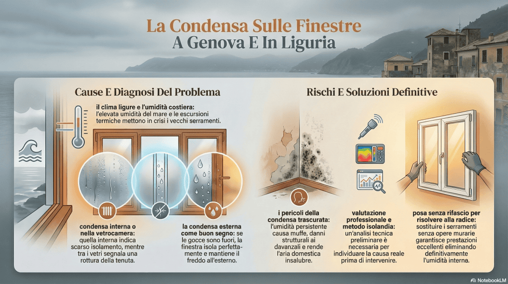 La Liguria ha un clima costiero con una umidità relativa tra le più alte d’Italia, specie nei mesi autunnali e invernali. Il mare è vicino, le escursioni termiche sono frequenti, e molte abitazioni — spesso in palazzine degli anni ‘60 e ‘70 — hanno finestre che non reggono più queste condizioni.